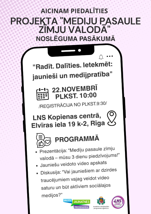 Aicinām ikvienu uz projekta “Mediju pasaule zīmju valodā” noslēguma pasākumu “Radīt. Dalīties. Ietekmēt: jaunieši un medijpratība”.