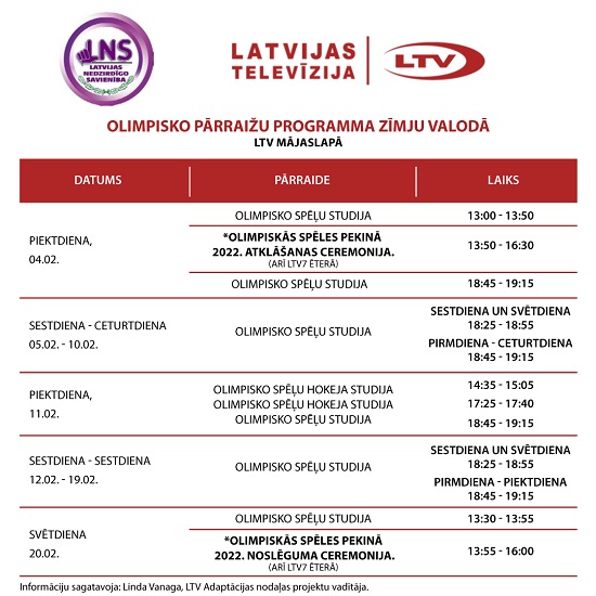 Zīmju valodas tulkojums - Pekinas Olimpiskās spēles atklāšanas ceremonijā - 4. februārī plkst. 13:50 LTV7 kanālā un noslēguma ceremonijā - 20. februārī plkst. 13:55 LTV7 kanālā. Bet Olimpiskās sporta studijas katru dienu no 4.-20. februārim ar zīmju valodas tulkojumu - LTV mājaslapā.