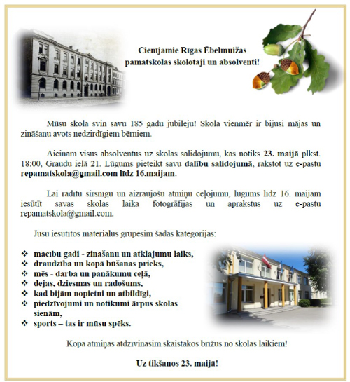 Rīgas Ēbelmuižas pamatskolas aicinājums uz skolas salidojumu