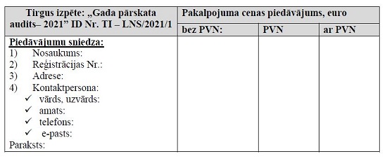 Tirgus cenu izpētes rezultātā tiks noslēgts līgums par LNS darbības gada pārskata (par 2021. gadu) audita pakalpojumu, ja piedāvātā summa būs saimnieciski izdevīgākā.